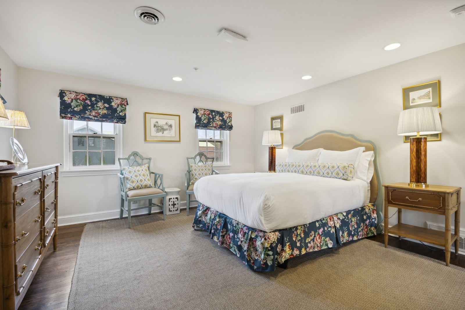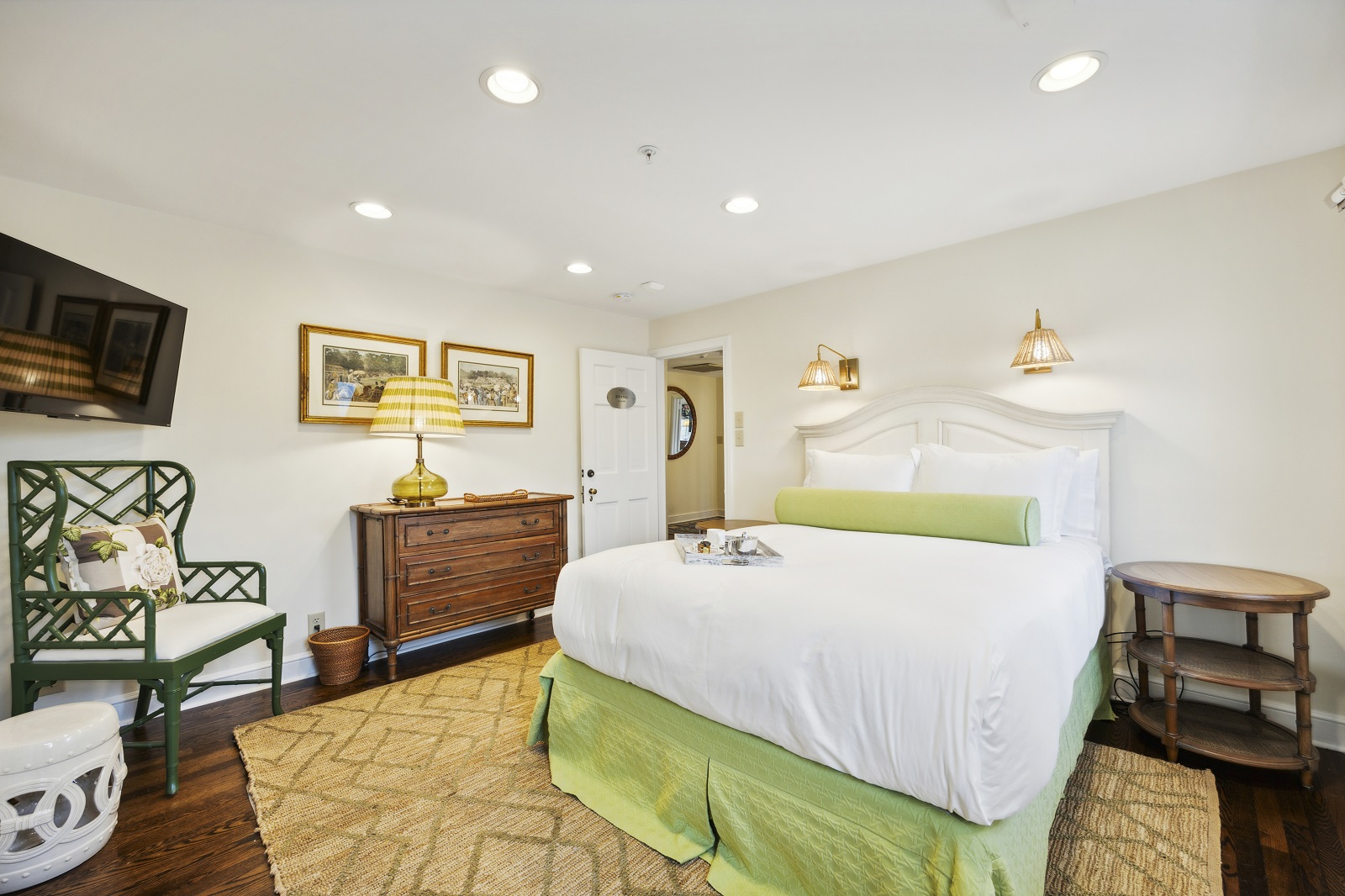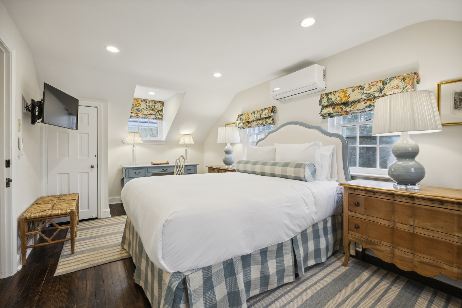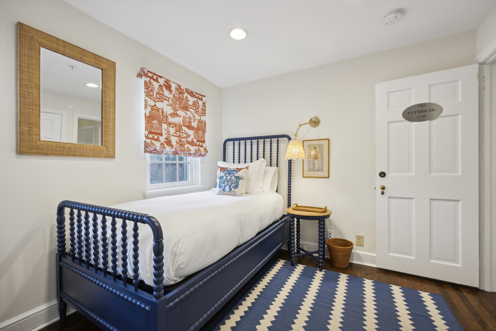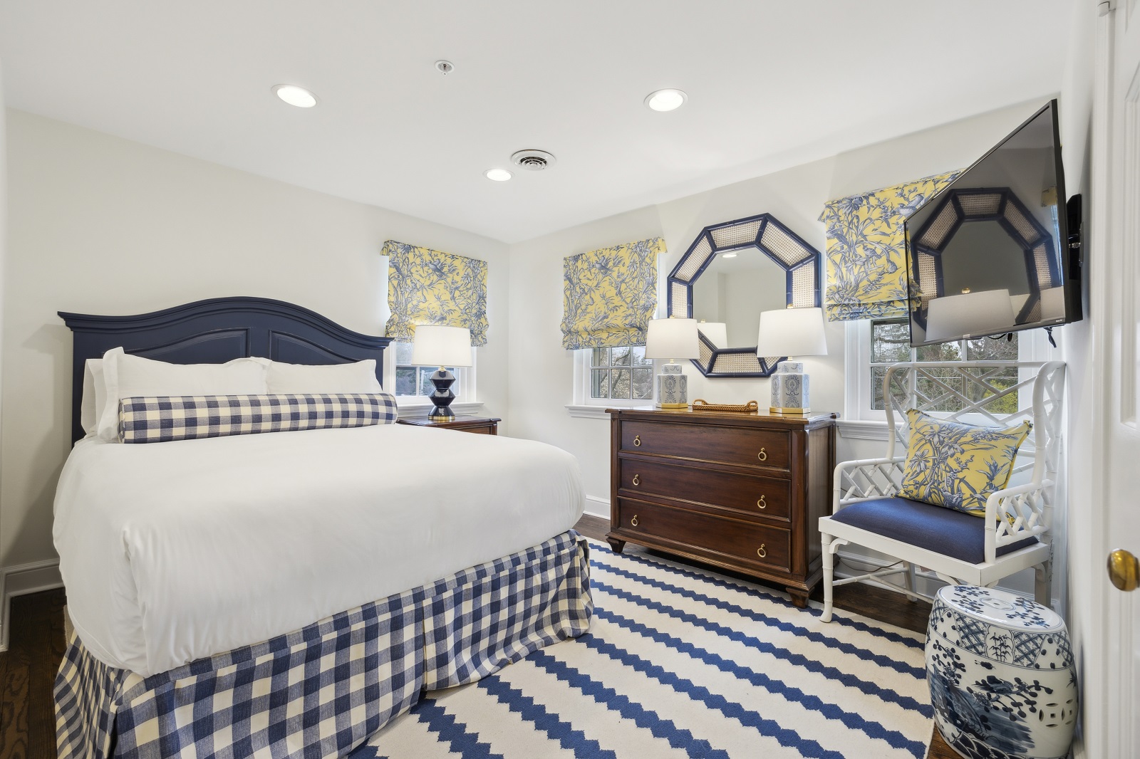 Located at the top of the staircase, the Humphreys Room features beautiful blue and yellow accents with bamboo and lattice designs, a queen-sized bed, custom furniture, a smart television and terry cloth robes for your comfort. Adjacent to the bedroom is the hall bath with a combined shower and bathtub, shared only with the Sayres Jr. Room.