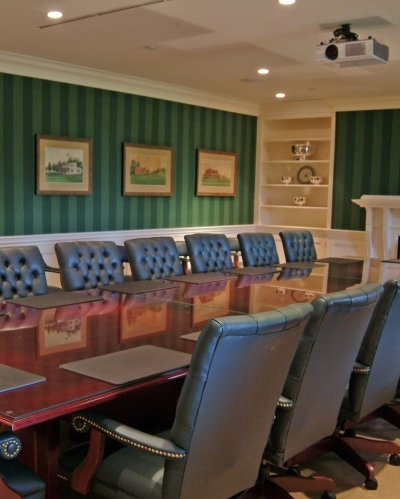 Perfect for executive meetings and presentations, the Board Room features high-back leather chairs surrounding a grand table and includes modern audio-visual capabilities.