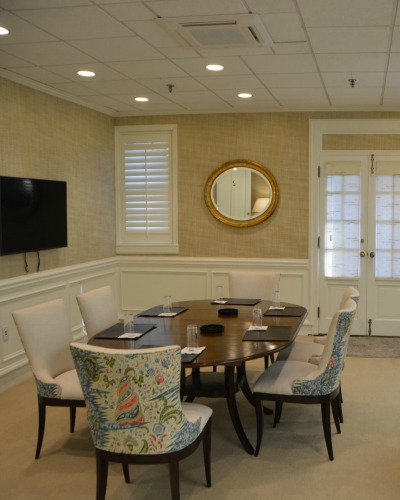 This intimate meeting room offers a quiet, comfortable setting ideal for small gatherings, private discussions, or focused work sessions. With its soft, welcoming décor, warm finishes, and natural light, the space feels both inviting and refined.
