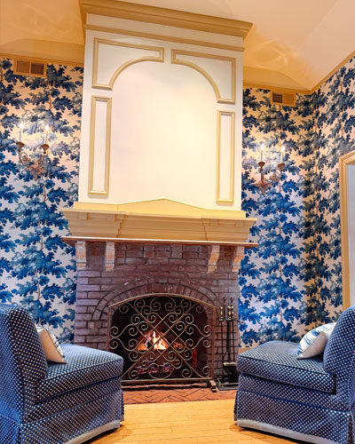 With crown molding, a decorative fireplace, and access to an adjoining terrace, this space creates a warm and inviting environment for smaller dinners, luncheons, and private celebrations.